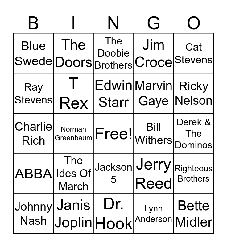 This bingo card has a free space and 25 words: The Ides Of March, Dr. Hook, Edwin Starr, Johnny Nash, Cat Stevens, Blue Swede, Ray Stevens, The Doors, Bill Withers, Jackson 5, Marvin Gaye, Charlie Rich, Jerry Reed, Righteous Brothers, T Rex, Carpenters, Derek & The Dominos, The Doobie Brothers, Ricky Nelson, Norman Greenbaum, Bette Midler, Janis Joplin, ABBA, Jim Croce and Lynn Anderson.