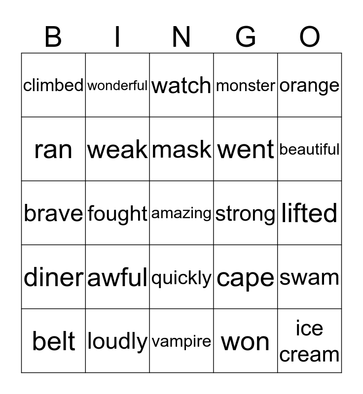 This bingo card has a free space and 24 words: awful, loudly, mask, belt, orange, climbed, ran, wonderful, strong, quickly, went, brave, cape, swam, weak, won, lifted, watch, beautiful, fought, ice cream, diner, monster and vampire.