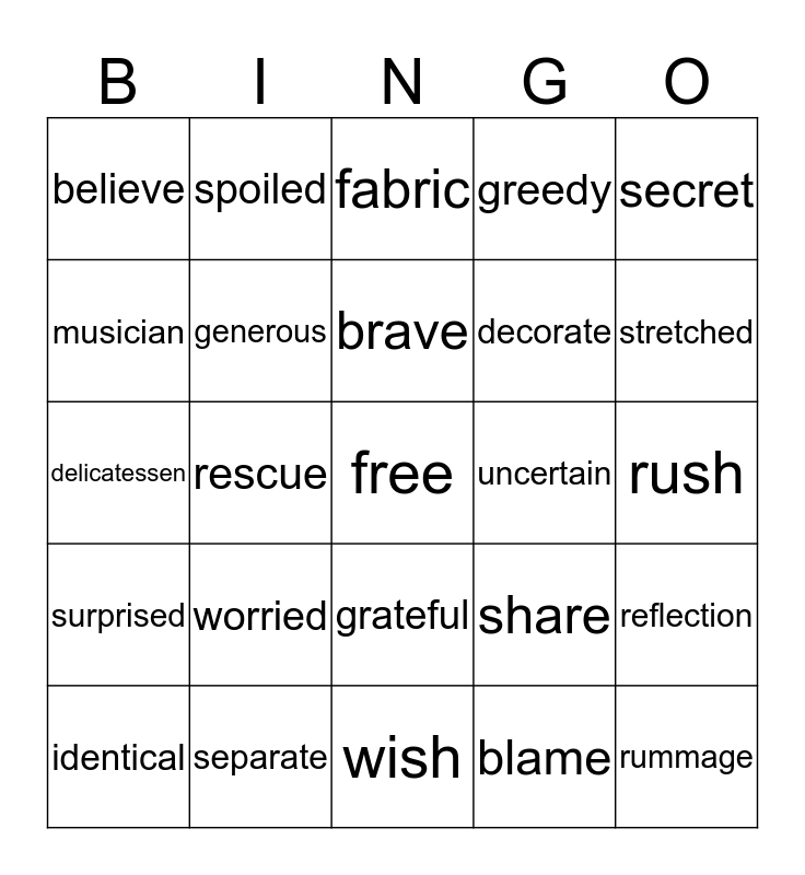 This bingo card has a free space and 35 words: together, knead, stomp, generous, grateful, greedy, musician, angry, brave, eager, delicatessen, secret, cradle, dough, believe, uncertain, blame, rescue, surprised, rummage, share, identical, reflection, separate, fabric, stretched, signs, forgive, decorate, rush, invite, wish, worried, spoiled and seal.