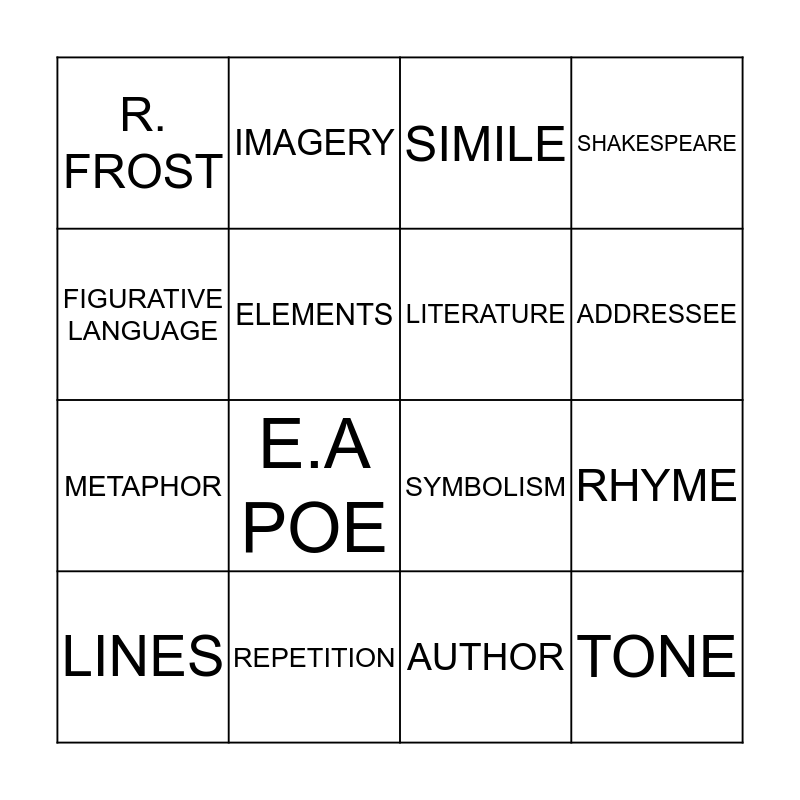This bingo card has 25 words: POETRY, RHYTHM, ADDRESSEE, LENGTH, FIGURATIVE LANGUAGE, R. FROST, ELEMENTS, IMAGERY, REPETITION, VERSE, METAPHOR, SYMBOLISM, R. KIPLING, STANZA, LITERATURE, ONOMATOPOEIA, AUTHOR, SIMILE, E.A POE, RHYME, LINES, PERSONA, TONE, SHAKESPEARE and RHYME SCHEME.