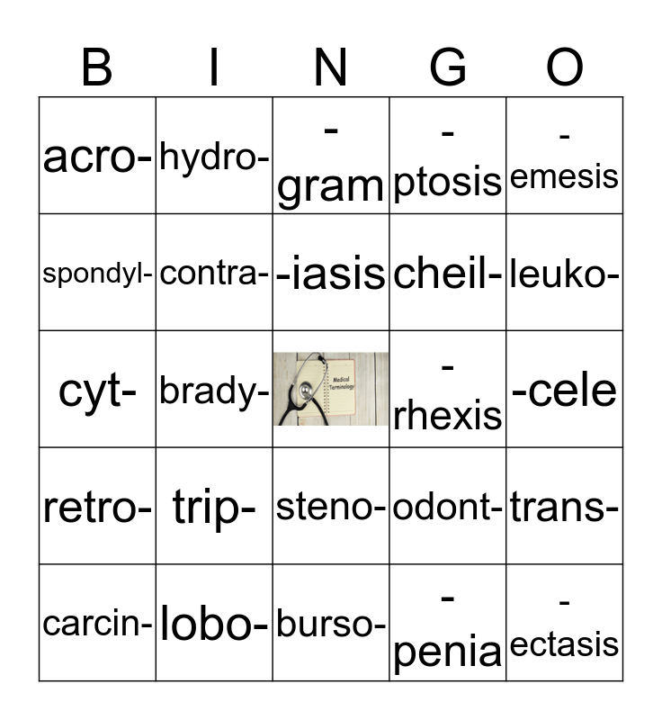 This bingo card has a free space and 29 words: cost-, lobo-, -gram, acro-, -emesis, acro-, contra-, -iasis, -rhexis, trans-, carcin-, brady-, -penia, -ectasis, cyt-, gen-, burso-, odont-, leuko-, retro-, trip-, strept-, cheil-, -cele, spondyl-, hydro-, steno-, -ptosis and melan-.