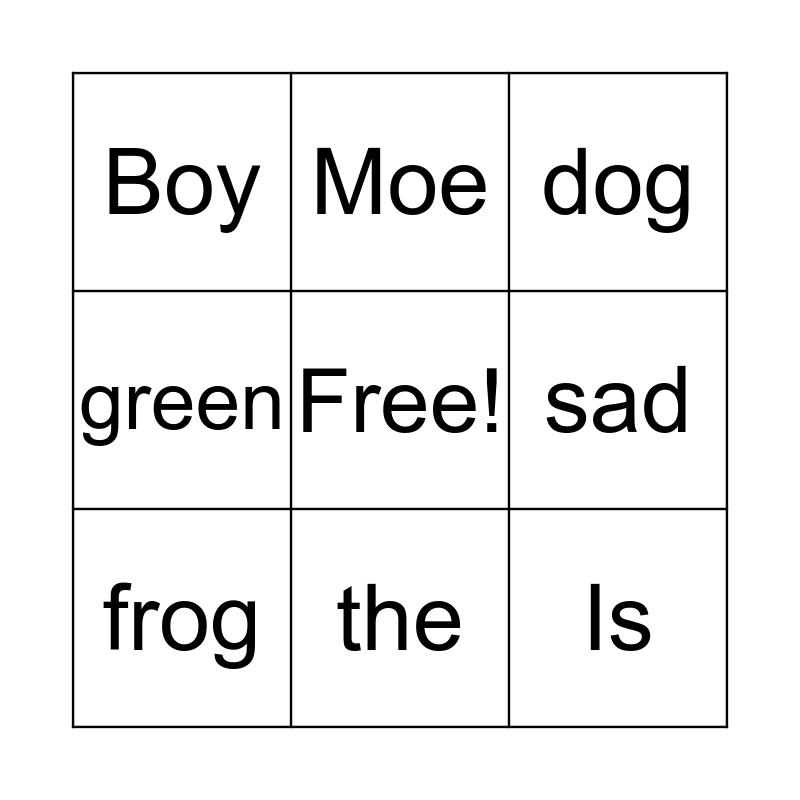 This bingo card has a free space and 14 words: girl, Friend, frog, Moe, green, Is, jump, me, the, Boy, happy, sad, dog and cat.