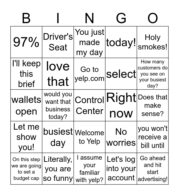 This bingo card has a free space and 25 words: busiest day, I assume your familiar with yelp?, Go to yelp.com, On this step we are going to set a budget cap, Holy smokes!, 97%, I'll keep this brief, Driver's Seat, Right now, Welcome to Yelp, select, wallets open, No worries, you won't receive a bill until, love that, No one looks on page 2, that's where people hide dead bodies, Does that make sense?, You just made my day, How many customers do you see on your busiest day?, would you want that business today?, Go ahead and hit start advertising!, Literally, you are so funny, Let me show you!, today! and Let's log into your account.