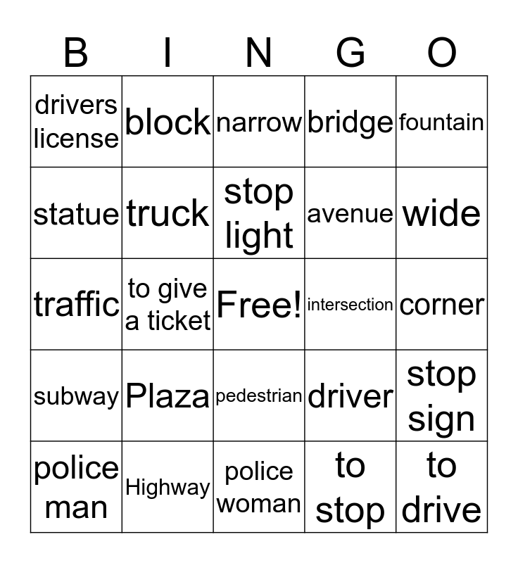 This bingo card has a free space and 24 words: Plaza, Highway, stop light, police man, fountain, drivers license, statue, block, intersection, pedestrian, avenue, traffic, driver, stop sign, truck, to stop, corner, narrow, wide, to give a ticket, to drive, subway, bridge and police woman.
