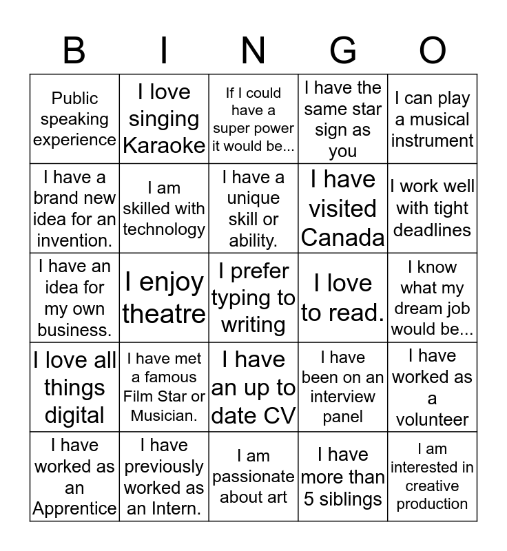 This bingo card has a free space and 24 words: I have met a famous Film Star or Musician., I have previously worked as an Intern., I have a unique skill or ability., I have worked as an Apprentice, I can play a musical instrument, Public speaking experience, I have a brand new idea for an invention., I love singing Karaoke, I love to read., I have an up to date CV, I have visited Canada, I have an idea for my own business., I have been on an interview panel, I have worked as a volunteer, I am skilled with technology, I have more than 5 siblings, I know what my dream job would be..., If I could have a super power it would be..., I work well with tight deadlines, I enjoy theatre, I am interested in creative production, I love all things digital, I have the same star sign as you and I am passionate about art.