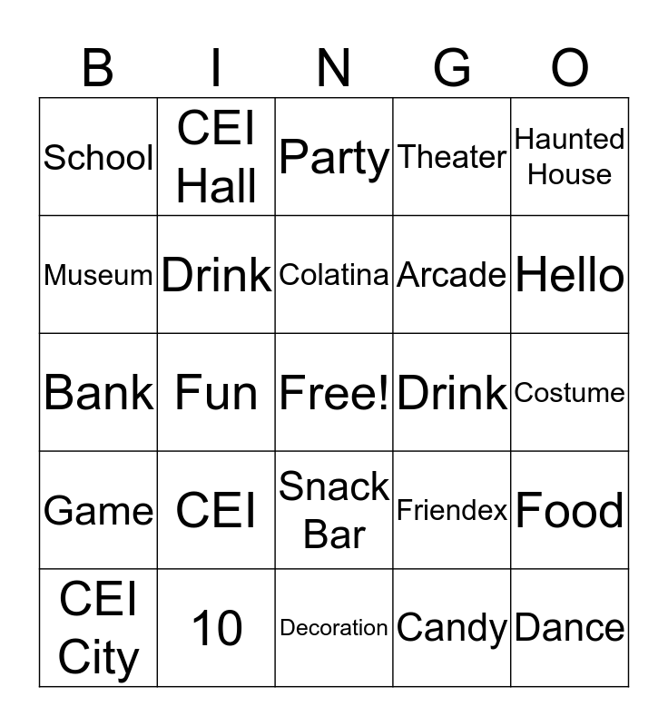 This bingo card has a free space and 24 words: CEI, 10, Colatina, CEI City, Haunted House, School, Museum, CEI Hall, Drink, Snack Bar, Arcade, Bank, Friendex, Food, Drink, Candy, Costume, Party, Hello, Fun, Dance, Game, Theater and Decoration.