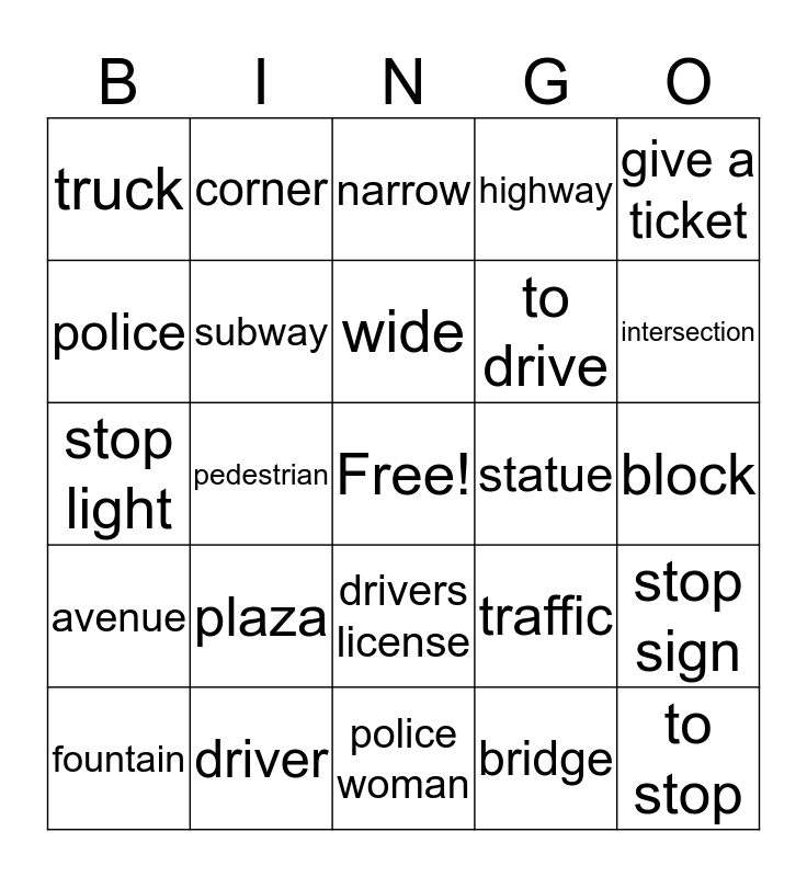 This bingo card has a free space and 24 words: plaza, driver, wide, fountain, give a ticket, truck, police, corner, statue, drivers license, to drive, stop light, traffic, stop sign, subway, bridge, block, narrow, intersection, pedestrian, to stop, avenue, highway and police woman.