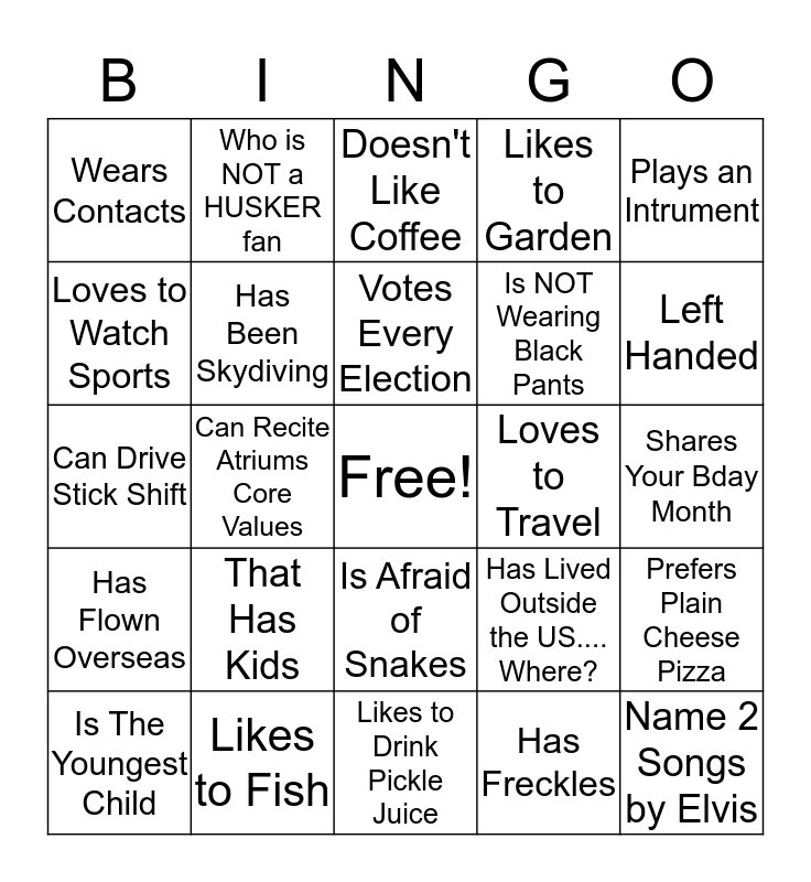 This bingo card has a free space and 24 words: That Has Kids, Likes to Fish, Votes Every Election, Is The Youngest Child, Plays an Intrument, Wears Contacts, Loves to Watch Sports, Who is NOT a HUSKER fan, Loves to Travel, Is Afraid of Snakes, Is NOT Wearing Black Pants, Can Drive Stick Shift, Has Lived Outside the US.... Where?, Prefers Plain Cheese Pizza, Has Been Skydiving, Has Freckles, Shares Your Bday Month, Doesn't Like Coffee, Left Handed, Can Recite Atriums Core Values, Name 2 Songs by Elvis, Has Flown Overseas, Likes to Garden and Likes to Drink Pickle Juice.