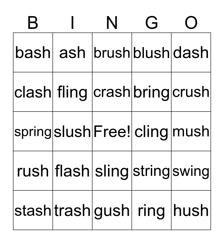 This bingo card has a free space and 24 words: flash, trash, crash, stash, dash, bash, clash, ash, cling, sling, bring, spring, string, swing, fling, ring, mush, brush, crush, slush, hush, rush, blush and gush.