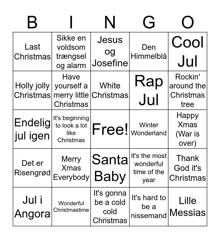 This bingo card has a free space and 45 words: En rose så jeg skyde, Lille Messias, Do they know it's Christmas?, Jul i Angora, Søren Banjomus, It's hard to be a nissemand, Jesus og Josefine, Gangs' Julesang, Cool Jul, Wonderful Christmastime, Den Himmelblå, Winter Wonderland, Santa Baby, Merry Xmas Everybody, Driving home for Christmas, It's gonna be a cold cold Christmas, Let it Snow! Let it Snow! Let it Snow!, Endelig jul igen, The Støvle Dance, Rockin' around the Christmas tree, Sikke en voldsom trængsel og alarm, Merry Christmas everyone, Feliz Navidad, Last Christmas, All I want for christmas is you, Happy Xmas (War is over), Blue Christmas, Vi er på vej til - julemand, It's the most wonderful time of the year, Det er Risengrød, Jul det' cool, Thank God it's Christmas, Santa Claus is coming to town, Allertiders Jul, Kære Julemayin', It's beginning to look a lot like Christmas, Mary's Boy Child, Jingle Bell rock, Jul på Vesterbro, White Christmas, Holly jolly Christmas, Rap Jul, In Santa's Claws, Have yourself a merry little Christmas and Til julebal i Nisseland.