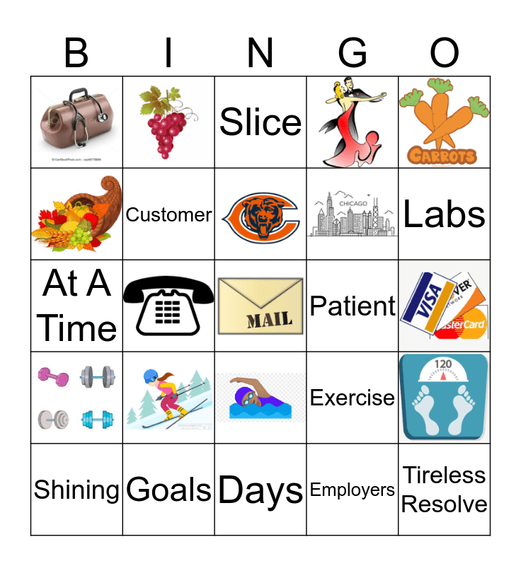 This bingo card has 29 images, a free space and 35 words: Welcoming, Right, Billing, Skillful, Urgent, Labs, Shining, Improving, Employers, Group Health, Customer, At A Time, Patient, Respectful, America's, Clinics, Tireless Resolve, Goals, 121+, Exercise, Insurance, Blue, Book, Days, Service, Listen, Care, Slice, Healing Focus, Team, Player, One, Fall Veggies, Treated and Health.