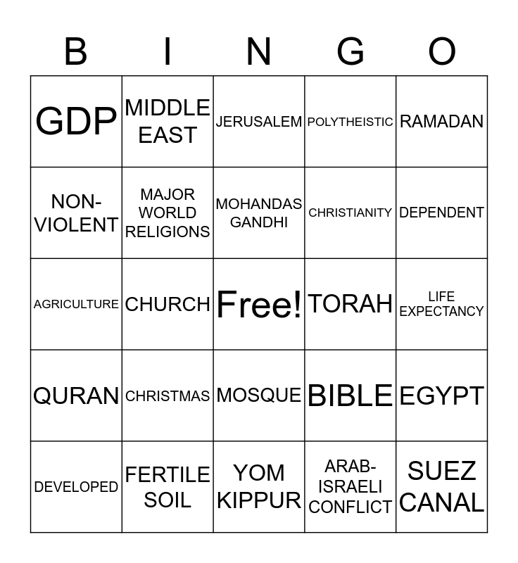 This bingo card has a free space and 44 words: OPEC, SUEZ CANAL, UNITED STATES, DEVELOPED, DEVELOPING, ARAB-ISRAELI CONFLICT, JERUSALEM, JUDAISM, RAMADAN, FERTILE SOIL, POLYTHEISTIC, TORAH, MOSQUE, CHRISTMAS, PRAY 5 TIMES A DAY, YOM KIPPUR, JEWS, AGRICULTURE, GANGES RIVER, DEPENDENT, MIDDLE EAST, STANDARD OF LIVING, LIFE EXPECTANCY, GDP, LITERACY RATE, LIFE EXPECTANCY, CHRISTIANS, SYNAGOGUE, BIBLE, QURAN, ISLAM, EGYPT, CHRISTIANS, PILGRIMAGE TO MECCA, CHURCH, SAUDI ARABIA, INTERDEPENDENCE, FASTING, MOHANDAS GANDHI, NON-VIOLENT, CHRISTIANITY, MONOTHEISTIC, MAJOR WORLD RELIGIONS and 5 PILLARS OF FAITH.