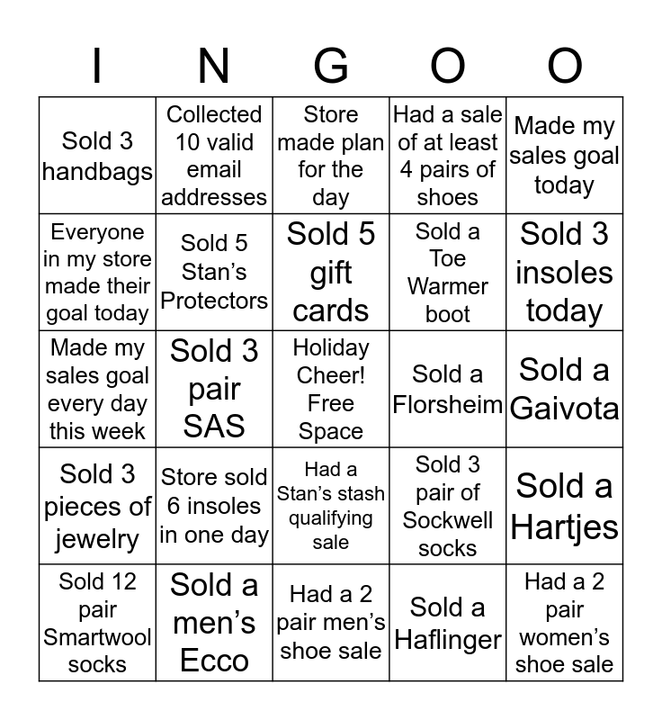 This bingo card has a free space and 24 words: Store sold 6 insoles in one day, Sold a men’s Ecco, Sold 5 gift cards, Sold 12 pair Smartwool socks, Made my sales goal today, Sold 3 handbags, Everyone in my store made their goal today, Collected 10 valid email addresses, Sold a Florsheim, Had a Stan’s stash qualifying sale, Sold a Toe Warmer boot, Made my sales goal every day this week, Sold 3 pair of Sockwell socks, Sold a Hartjes, Sold 5 Stan’s Protectors, Sold a Haflinger, Sold a Gaivota, Store made plan for the day, Sold 3 insoles today, Sold 3 pair SAS, Had a 2 pair women’s shoe sale, Sold 3 pieces of jewelry, Had a sale of at least 4 pairs of shoes and Had a 2 pair men’s shoe sale.