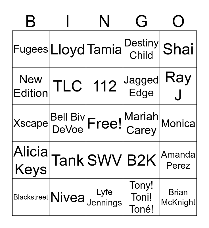 This bingo card has a free space and 35 words: Boyz 2 Men, Aaliyah, Jodeci, TLC, SWV, Destiny Child, New Edition, Dru Hill, 112, K-Ci & JoJo, Xscape, Shai, Guy, Silk, Fugees, Mariah Carey, Tony! Toni! Toné!, Bell Biv DeVoe, Alicia Keys, Brian McKnight, B2K, Blackstreet, Amanda Perez, Nivea, Tamia, Ray J, Jelly Rowland, Pretty Ricky, Jagged Edge, Monica, J. Holiday, Lyfe Jennings, Tank, Lloyd and Mary J. Blige.
