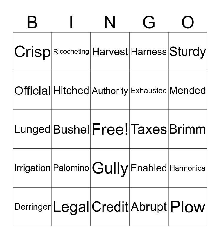 This bingo card has a free space and 24 words: Palomino, Legal, Authority, Derringer, Sturdy, Crisp, Official, Ricocheting, Taxes, Gully, Exhausted, Lunged, Enabled, Harmonica, Hitched, Abrupt, Brimm, Harvest, Mended, Bushel, Plow, Irrigation, Harness and Credit.