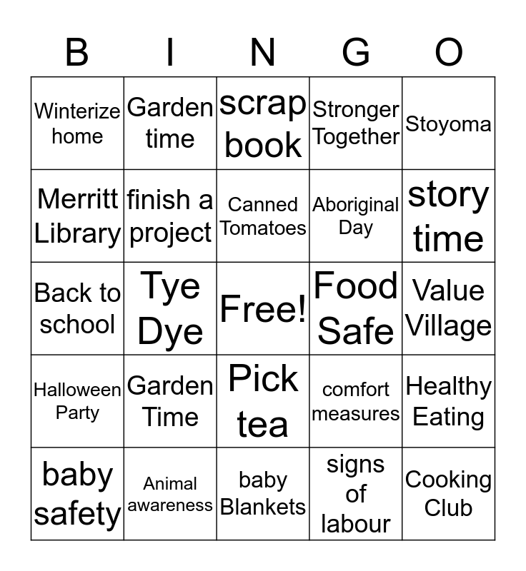 This bingo card has a free space and 69 words: 2nd hand smoke, labour n birth, pick huckle- berries, Making Play dough, Value Village, pick soap berries, finish a project, Monk Park, Aboriginal Day, RIH Hospital, Halloween Party, No bake cookies, Stronger Together, Stoyoma, Mother Goose, Garden Time, Canned Tomatoes, Food Safe, Summer snacks, Back to school, Animal awareness, baby Blankets, comfort measures, immuniza-tions, Fire Protection, CIBC budgeting, Knitting, Cooking Club, Cooking Club, hand washing, Garden time, sage picking, free, walking club, family bowling, beginners sewing, salt dough, cookies in a jar, story time, baby safety, pumpkin patch, scrap book, signs of labour, play date, make jams, tomato sauce, Pick tea, Othello Tunnels, beaded poppy, Winterize home, Tye Dye, CPR, Dr.Snee eye care, Healthy Eating, Pregnancy check, car seat safety, walking club, stewed tomatoes, Grief and Loss, Merritt Library, Day care, Value Village, Paper Plates, Adventures, Honour of babies, stages of pregnancy, metis society, !SPARC and Birth plan.
