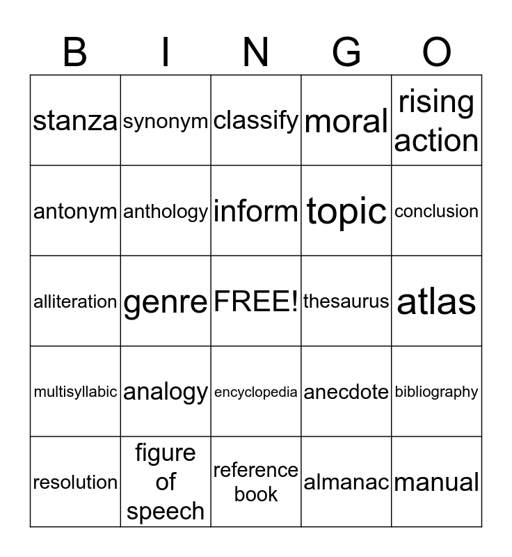 This bingo card has a free space and 24 words: analogy, figure of speech, inform, resolution, rising action, stanza, antonym, synonym, thesaurus, encyclopedia, topic, alliteration, anecdote, bibliography, anthology, almanac, atlas, classify, conclusion, genre, manual, multisyllabic, moral and reference book.