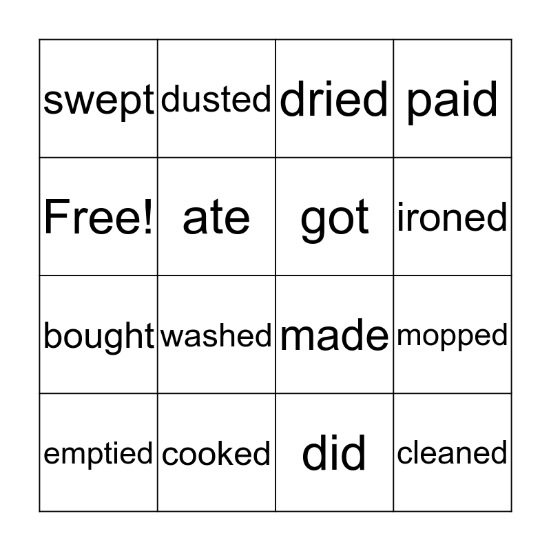 This bingo card has 16 words: cooked, mopped, dried, swept, bought, dusted, made, did, Free!, ate, emptied, paid, washed, ironed, got and cleaned.