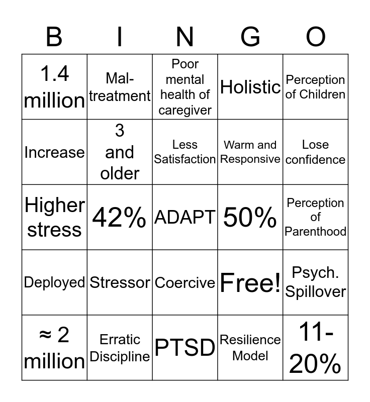 This bingo card has 25 words: Stressor, PTSD, Less Satisfaction, ≈ 2 million, Perception of Children, 1.4 million, Increase, Mal-treatment, 50%, Coercive, Warm and Responsive, Higher stress, Free!, Psych. Spillover, 3 and older, 11-20%, Perception of Parenthood, Poor mental health of caregiver, Lose confidence, 42%, ADAPT, Erratic Discipline, Deployed, Holistic and Resilience Model.