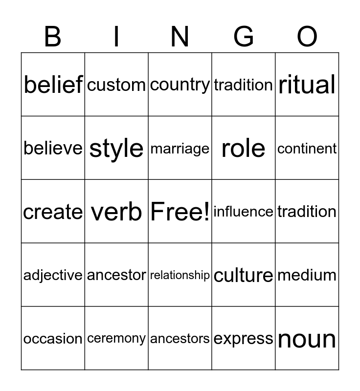 This bingo card has a free space and 24 words: ancestor, ceremony, marriage, occasion, ritual, belief, believe, custom, influence, relationship, role, create, culture, medium, style, express, tradition, country, continent, verb, noun, adjective, tradition and ancestors.