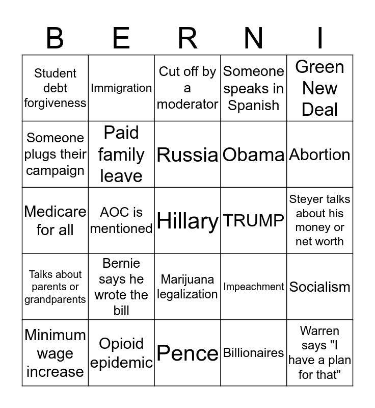 This bingo card has a free space and 24 words: Bernie says he wrote the bill, Opioid epidemic, Russia, Minimum wage increase, Green New Deal, Student debt forgiveness, Someone plugs their campaign, Immigration, TRUMP, Marijuana legalization, Obama, Medicare for all, Impeachment, Socialism, Paid family leave, Billionaires, Steyer talks about his money or net worth, Cut off by a moderator, Abortion, AOC is mentioned, Warren says "I have a plan for that", Talks about parents or grandparents, Someone speaks in Spanish and Pence.