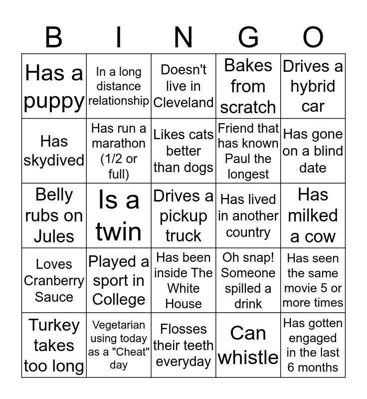 This bingo card has 30 words: Turkey takes too long, Born in November, Likes cats better than dogs, Someone is late, Drives a hybrid car, Has a puppy, In a long distance relationship, Has been inside The White House, Has lived in another country, Has gotten engaged in the last 6 months, Loves Cranberry Sauce, Has run a marathon (1/2 or full), Someone that you have never met before, Can whistle, Has seen the same movie 5 or more times, Has never been outside of the U.S., Is a twin, Drives a pickup truck, Oh snap! Someone spilled a drink, Has gone on a blind date, Belly rubs on Jules, Vegetarian using today as a "Cheat" day, Doesn't live in Cleveland, Friend that has known Paul the longest, Has milked a cow, Has skydived, Played a sport in College, Flosses their teeth everyday, Bakes from scratch and Loves Austin, TX.