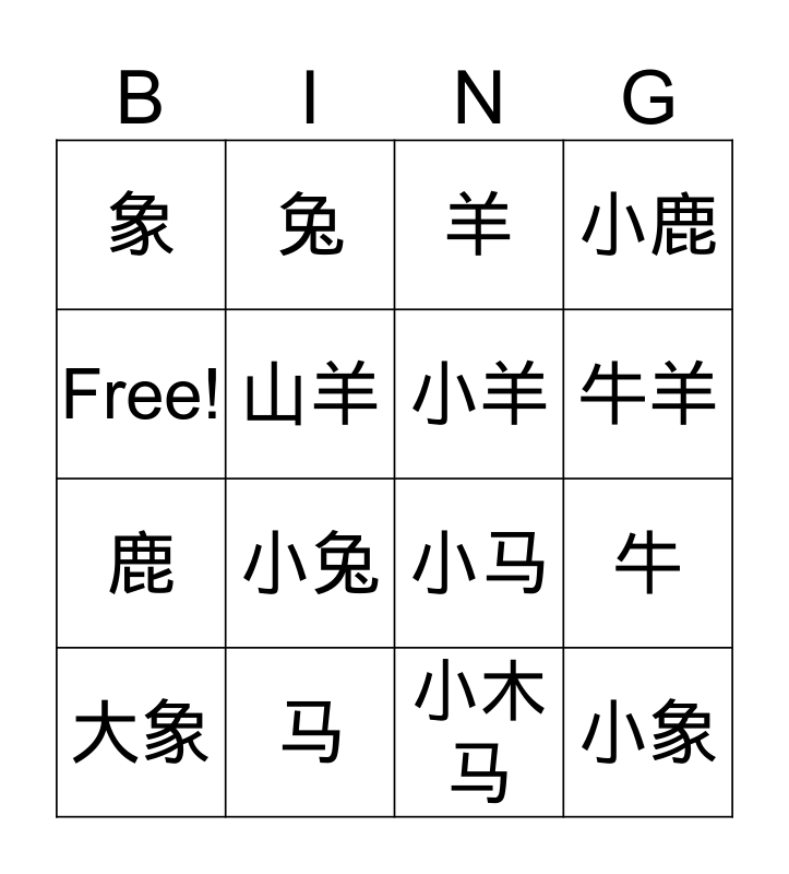 This bingo card has 16 words: 马, 牛, 羊, 象, 鹿, 兔, 小马, 小木马, Free!, 山羊, 大象, 小鹿, 小兔, 牛羊, 小羊 and 小象.