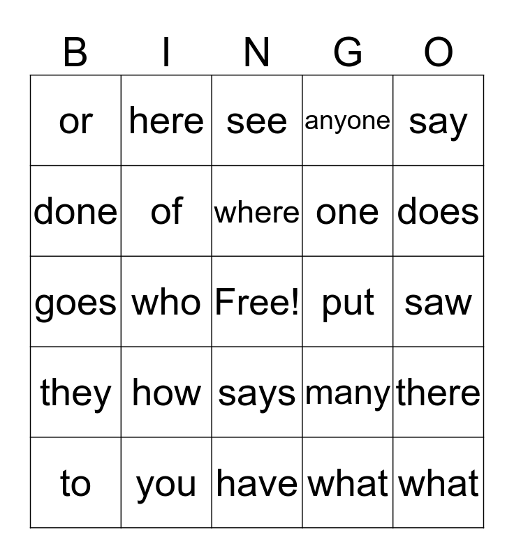 This bingo card has a free space and 29 words: to, do, who, for, or, see, of, how, put, you, saw, what, have, what, does, are, says, they, say, goes, many, any, one, done, anyone, here, there, where and like.