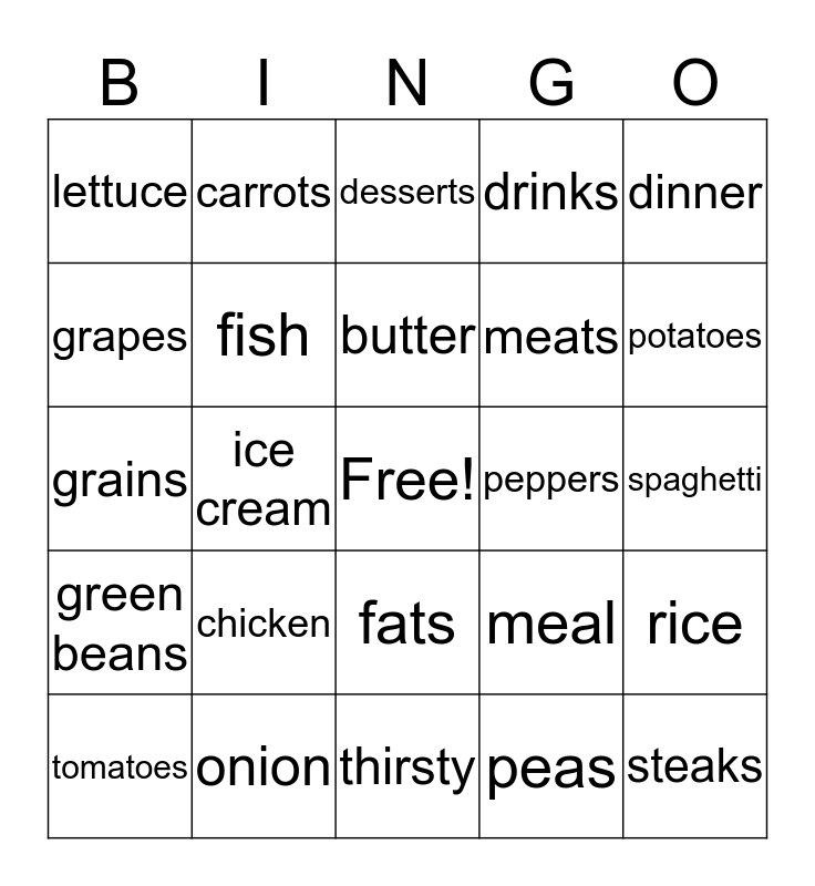 This bingo card has a free space and 24 words: chicken, onion, butter, tomatoes, dinner, lettuce, grapes, carrots, peppers, fats, meats, grains, meal, rice, fish, peas, spaghetti, desserts, potatoes, ice cream, steaks, green beans, drinks and thirsty.
