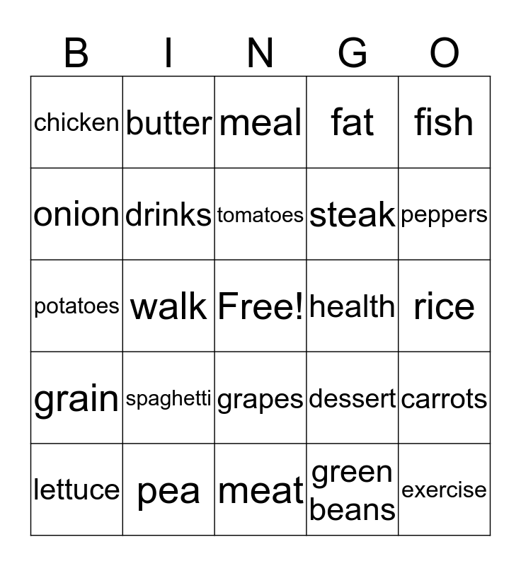 This bingo card has a free space and 24 words: spaghetti, pea, tomatoes, lettuce, fish, chicken, onion, butter, health, grapes, steak, potatoes, dessert, carrots, drinks, green beans, rice, meal, peppers, walk, exercise, grain, fat and meat.