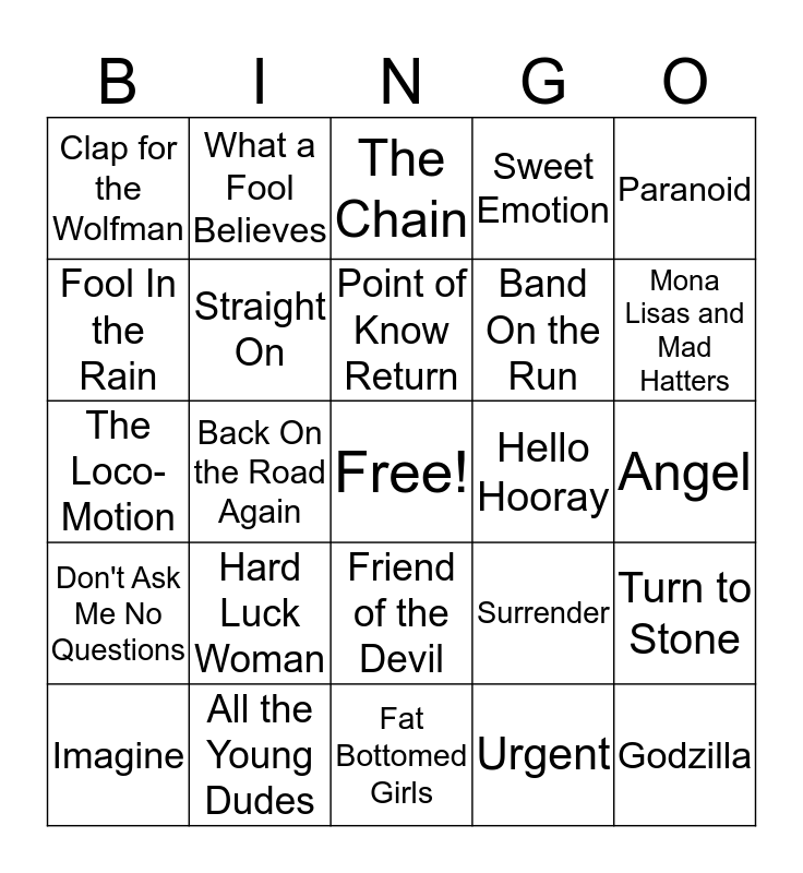 This bingo card has a free space and 50 words: Love Hurts, Godzilla, Another Brick In the Wall, Fat Bottomed Girls, Hard Luck Woman, Move It On Over, What a Fool Believes, Aqualung, Fool In the Rain, Southern Man, Straight On, Sweet Emotion, Turn to Stone, Surrender, Somebody to Love, Down On the Corner, Point of Know Return, Hello Hooray, You've Made Me So Very Happy, Paranoid, Back On the Road Again, Urgent, Clap for the Wolfman, Band On the Run, Mercedes Benz, Let Me Take You Home Tonight, Mona Lisas and Mad Hatters, Just a Song Before I Go, The Chain, Friend of the Devil, Lucky Man, Take It Easy, You Ain't Seen Nothing Yet, Life's Been Good, All the Young Dudes, Rockin' Into the Night, Wheel in the Sky, Hush, Flirtin' With Disaster, Angel, TNT, Can't Get Enough, If You Leave Me Now, Wonderful Tonight, Imagine, The Loco-Motion, Soulshine, The Mighty Quinn, Don't Ask Me No Questions and Man On the Silver Mountain.