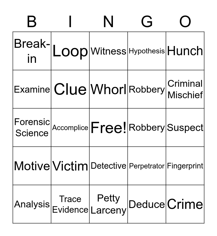 This bingo card has a free space and 29 words: Analysis, Scientific, Accomplice, Alibi, Break-in, Witness, Clue, Victim, Robbery, Trace Evidence, Suspect, Crime, Petty Larceny, Deduce, Criminal Mischief, Offender, Detective, Motive, Hunch, Forensic Science, Perpetrator, Investigator, Robbery, Examine, Hypothesis, Loop, Fingerprint, Whorl and Arch.