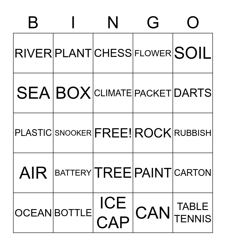 This bingo card has a free space and 24 words: BATTERY, BOTTLE, CLIMATE, OCEAN, SOIL, RIVER, SEA, PLANT, ROCK, TREE, PACKET, PLASTIC, PAINT, CARTON, BOX, CAN, RUBBISH, CHESS, DARTS, SNOOKER, TABLE TENNIS, AIR, FLOWER and ICE CAP.
