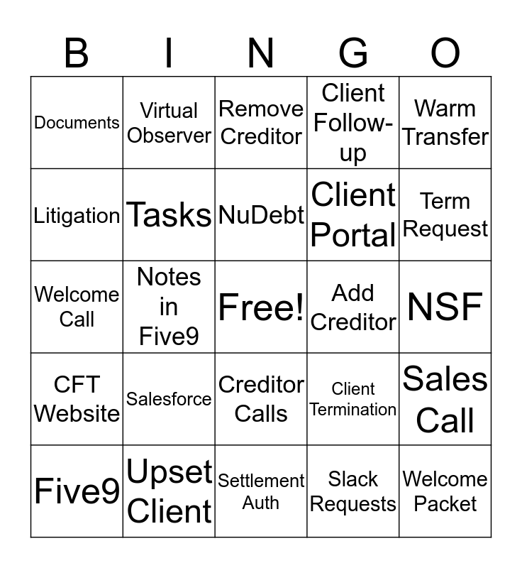 This bingo card has a free space and 24 words: Five9, Salesforce, NuDebt, Slack Requests, Warm Transfer, Documents, Virtual Observer, Remove Creditor, Add Creditor, NSF, Welcome Call, Tasks, Client Termination, Sales Call, Litigation, Upset Client, Settlement Auth, Client Follow-up, Term Request, CFT Website, Notes in Five9, Creditor Calls, Client Portal and Welcome Packet.