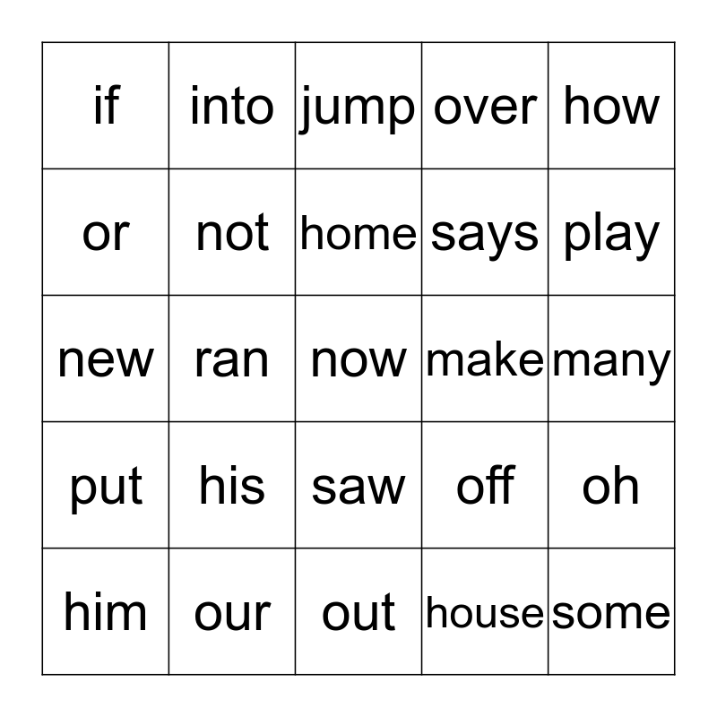 This bingo card has a free space and 24 words: him, his, home, house, how, if, into, jump, make, many, new, not, off, oh, or, our, out, over, play, put, ran, saw, says and some.