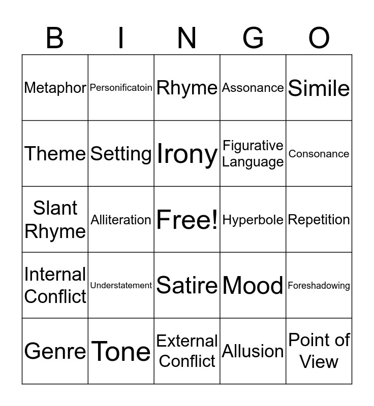 This bingo card has a free space and 24 words: Understatement, Tone, Irony, Genre, Simile, Metaphor, Theme, Personificatoin, Hyperbole, Satire, Figurative Language, Slant Rhyme, Mood, Foreshadowing, Setting, Allusion, Repetition, Rhyme, Consonance, Alliteration, Point of View, Internal Conflict, Assonance and External Conflict.