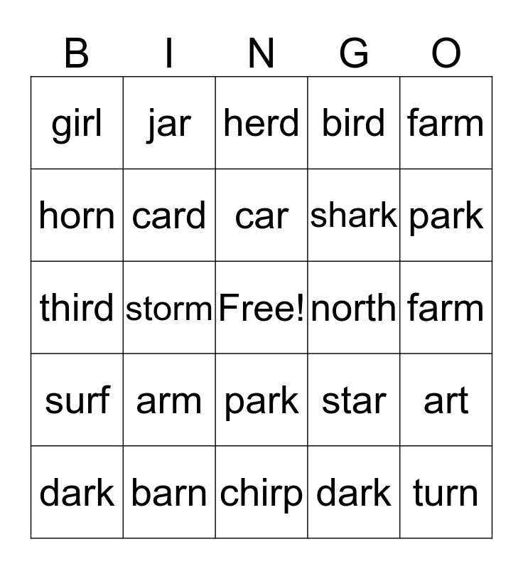 This bingo card has a free space and 24 words: arm, barn, car, dark, farm, girl, horn, jar, north, park, shark, third, star, art, card, dark, farm, herd, park, storm, turn, surf, bird and chirp.