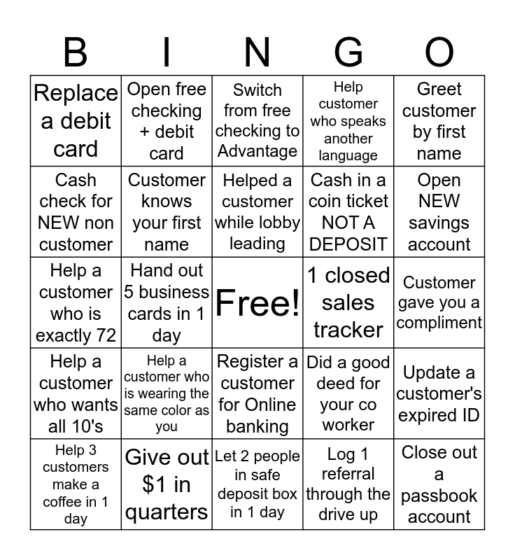 This bingo card has a free space and 24 words: Help a customer who is wearing the same color as you, Give out $1 in quarters, Helped a customer while lobby leading, Help 3 customers make a coffee in 1 day, Greet customer by first name, Replace a debit card, Cash check for NEW non customer, Open free checking + debit card, 1 closed sales tracker, Register a customer for Online banking, Cash in a coin ticket NOT A DEPOSIT, Help a customer who is exactly 72, Did a good deed for your co worker, Update a customer's expired ID, Customer knows your first name, Log 1 referral through the drive up, Customer gave you a compliment, Switch from free checking to Advantage, Open NEW savings account, Hand out 5 business cards in 1 day, Close out a passbook account, Help a customer who wants all 10's, Help customer who speaks another language and Let 2 people in safe deposit box in 1 day.