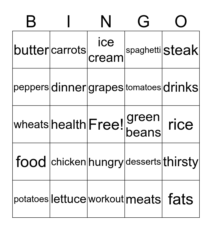 This bingo card has a free space and 24 words: chicken, lettuce, grapes, potatoes, steak, butter, peppers, carrots, green beans, hungry, tomatoes, wheats, desserts, thirsty, dinner, meats, rice, ice cream, drinks, health, fats, food, spaghetti and workout.