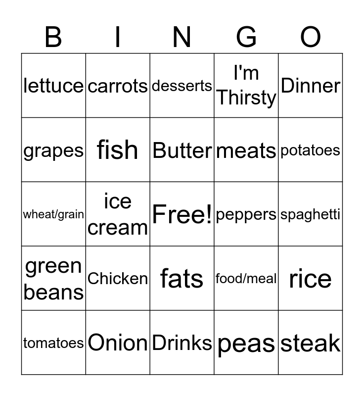 This bingo card has a free space and 24 words: Chicken, Onion, Butter, tomatoes, Dinner, lettuce, grapes, carrots, peppers, fats, meats, wheat/grain, food/meal, rice, fish, peas, spaghetti, desserts, potatoes, ice cream, steak, green beans, I'm Thirsty and Drinks.
