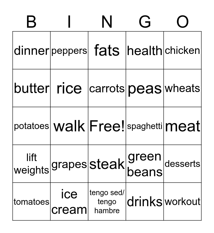 This bingo card has a free space and 24 words: grapes, ice cream, carrots, tomatoes, chicken, dinner, butter, peppers, spaghetti, steak, peas, potatoes, green beans, desserts, rice, drinks, meat, fats, wheats, walk, workout, lift weights, health and tengo sed/ tengo hambre.