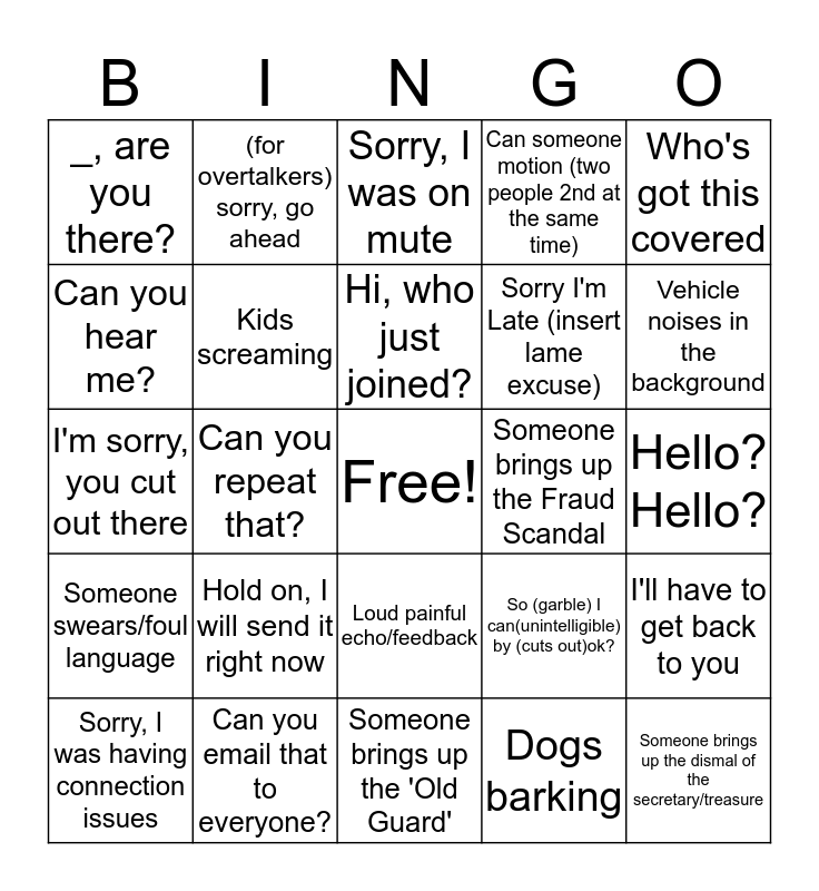 This bingo card has a free space and 26 words: Loud painful echo/feedback, Dogs barking, Hi, who just joined?, Can you email that to everyone?, Who's got this covered, _, are you there?, Can you hear me?, (for overtalkers) sorry, go ahead, Hello? Hello?, So (garble) I can(unintelligible) by (cuts out)ok?, Sorry I'm Late (insert lame excuse), I'm sorry, you cut out there, I'll have to get back to you, Sorry, I was having connection issues, Can you repeat that?, Hey __, can you mute your end?, Can someone motion (two people 2nd at the same time), Someone swears/foul language, Sorry, I was on mute, Someone brings up the dismal of the secretary/treasure, Vehicle noises in the background, Someone brings up the 'Old Guard', Someone brings up the Fraud Scandal, Hold on, I will send it right now, Kids screaming and Music in background.