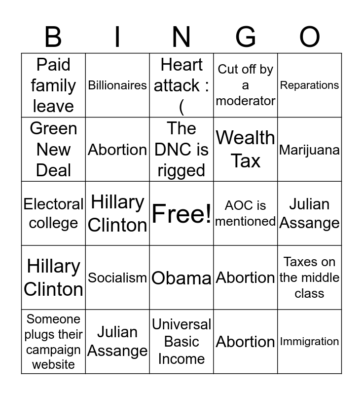 This bingo card has a free space and 81 words: Impeachment, Ukraine, Heart attack :(, Medicare for all, Marijuana, Minimum wage, Universal Basic Income, Obama, Someone plugs their campaign website, AOC is mentioned, Hecklers, Opioid epidemic, Cut off by a moderator, Paid family leave, Immigration, Green New Deal, Student debt, Socialism, Hillary Clinton, Julian Assange, Billionaires, Reparations, Electoral college, The DNC is rigged, Abortion, Impeachment, Ukraine, Heart attack, Medicare for all, Medicare for all who want it, Marijuana, Minimum wage, Universal Basic Income, Obama, Someone plugs their campaign website, AOC is mentioned, Hecklers, Opioid epidemic, Cut off by a moderator, Paid family leave, Immigration, Green New Deal, Student debt, Socialism, Hillary Clinton, Julian Assange, Billionaires, Reparations, Electoral college, Biden Mentions Obama, Abortion, Taxes on the middle class, Impeachment, Ukraine, Heart attack, Medicare for all, Medicare for all who want it, Marijuana, Minimum wage, Universal Basic Income, Obama, Someone plugs their campaign website, AOC is mentioned, Hecklers, Opioid epidemic, Cut off by a moderator, Paid family leave, Immigration, Green New Deal, Student debt, Socialism, Hillary Clinton, Julian Assange, Billionaires, Reparations, Electoral college, Biden Mentions Obama, Abortion, Taxes on the middle class, Wealth Tax and Pete makes you feel hopeful.