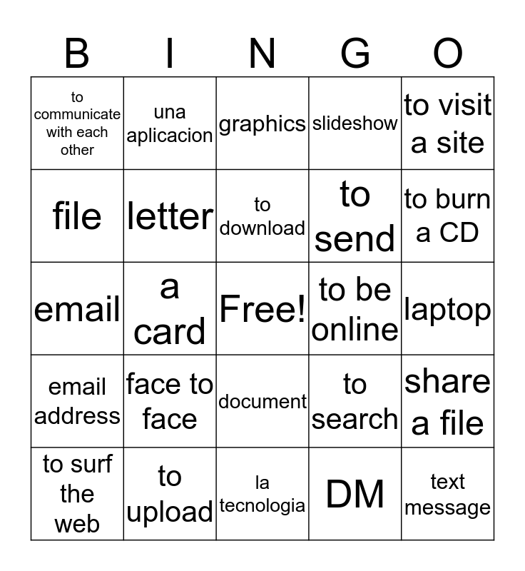 This bingo card has a free space and 24 words: face to face, to upload, to download, to surf the web, to visit a site, to communicate with each other, file, una aplicacion, to be online, document, to send, email, to search, share a file, letter, DM, laptop, graphics, to burn a CD, a card, text message, email address, slideshow and la tecnologia.
