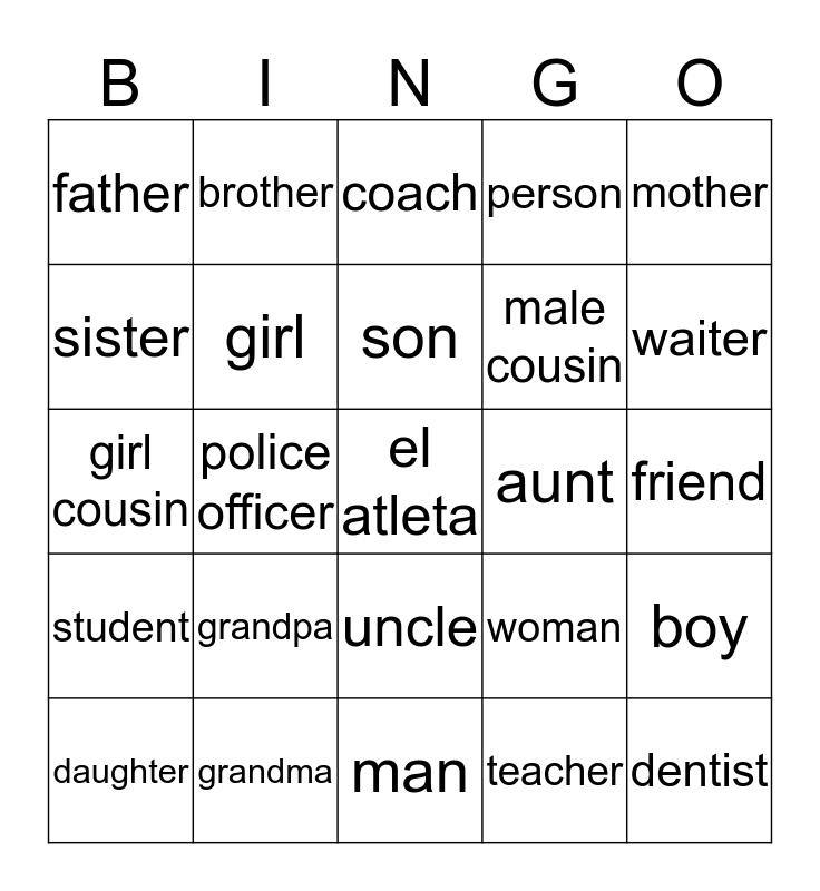 This bingo card has a free space and 24 words: grandpa, grandma, son, daughter, mother, father, sister, brother, aunt, uncle, male cousin, girl cousin, woman, boy, girl, teacher, friend, coach, waiter, police officer, dentist, student, person and man.