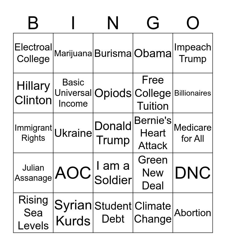 This bingo card has a free space and 24 words: AOC, Syrian Kurds, Opiods, Rising Sea Levels, Impeach Trump, Electroal College, Hillary Clinton, Marijuana, Bernie's Heart Attack, I am a Soldier, Free College Tuition, Immigrant Rights, Green New Deal, DNC, Basic Universal Income, Climate Change, Medicare for All, Burisma, Billionaires, Ukraine, Abortion, Julian Assanage, Obama and Student Debt.