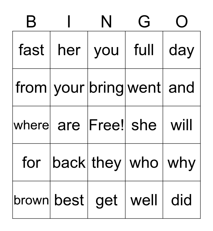 This bingo card has a free space and 24 words: back, best, bring, brown, day, fast, from, her, she, they, went, where, who, why, your, well, will, you, and, are, did, for, full and get.