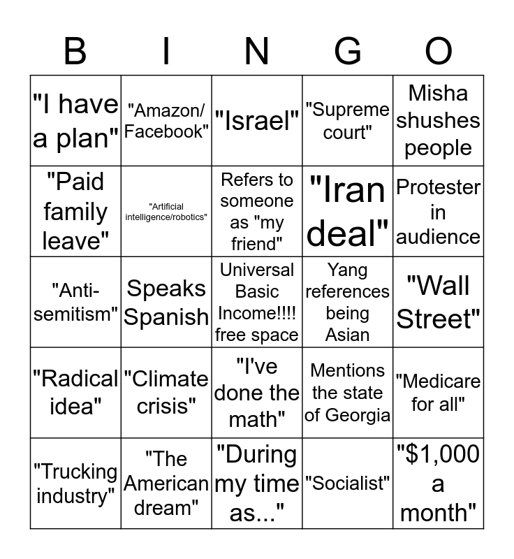 This bingo card has a free space and 49 words: "Barack Obama", "$1,000 a month", "Purple state", "During my time as...", "Climate crisis", "Equal pay", "Amazon/ Facebook", Billionaires, "Paid family leave", "My wife/ husband/ partner", "Artificial intelligence/robotics", "Supreme court", "Medicare for all", Mentions the state of Georgia, "the Southern border", Wears a tie that isn't red or blue, Refers to someone as "my friend", Yang references being Asian, "Impeach", Misha shushes people, Speaks Spanish, "Socialist", "I have a plan", "Iran deal", "Latin America", Protester in audience, "Trucking industry", "Data is the oil of the 21st century", "I've done the math", "Radical idea", Cut off by a moderator, Plugs their website, "Russia", "Marijuana/weed", "The American dream", Mentions their Twitter handle, Talks about their kid/s, "Universal pre-K", "Wall Street", "Free trade", "Drilling/ fracking", Someone's age is mentioned, "Green New Deal", "____ is a human right", "Anti- semitism", "Israel", "Dreamers", "The 1%" and "By a show of hands...".