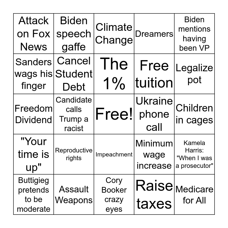 This bingo card has a free space and 40 words: Democratic Socialism, Freedom Dividend, President Obama, Cancel Student Debt, Assault Weapons, Impeachment, The 1%, Pandering to minorities, Biden mentions having been VP, "Your time is up", Candidate calls Trump a racist, Dreamers, Medicare for All, Children in cages, Ukraine phone call, Reproductive rights, Quid pro quo, Attack on Fox News, Candidate mentions their minority status, Climate Change, Kamela Harris: "When I was a prosecutor", Raise taxes, Free tuition, Sanders wags his finger, Kamala Harris nervous laughter, Cory Booker talks about his neighborhood, Middle class Americans, "Do I get to respond?", Russian Interference, Warren evades tax increase question, Wealth tax, Buttigieg pretends to be moderate, Obstruction, Minimum wage increase, Legalize pot, Cory Booker crazy eyes, Bribery, "Republican talking point", Biden speech gaffe and White supremacy.
