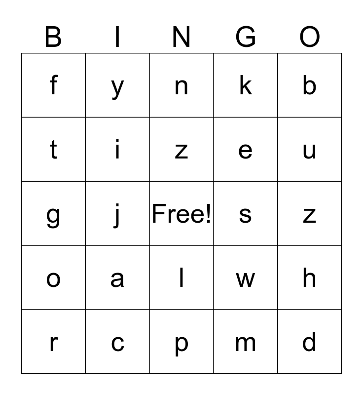 This bingo card has a free space and 24 words: a, c, z, r, b, f, t, y, s, l, e, g, w, h, i, m, z, n, u, j, d, o, k and p.
